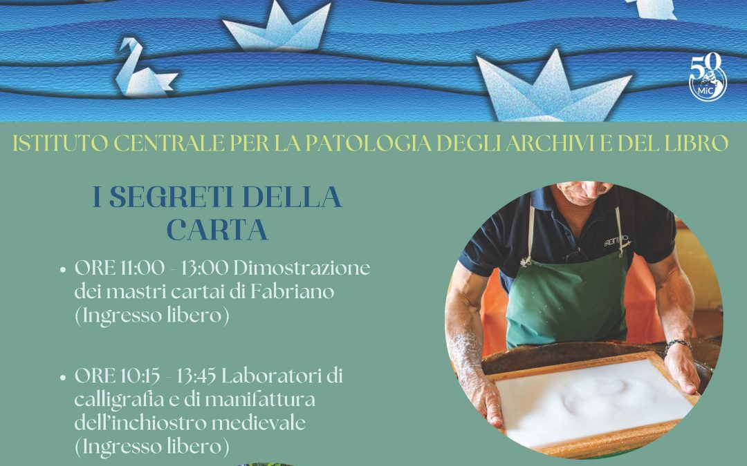 In occasione della #domenicadicarta, l’Istituto Centrale per la Patologia degli Archivi e del Libro apre le porte ai visitatori. Domenica 12 ottobre, dalle 10 alle 14, sarà possibile scoprire i segreti della fabbricazione della carta grazie alle dimostrazioni dei Mastri cartai di Fabriano e sperimentare i nostri laboratori di calligrafia e di manifattura dell’inchiostro medievale.